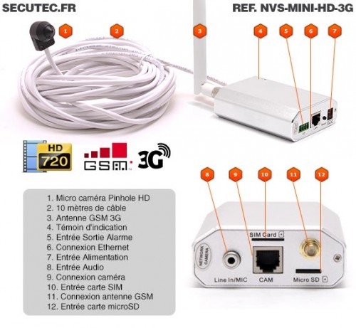 La caméra fourni avec le NVS-MINI-HD-3G est équipée d'un capteur CMOS 1/4" permettant d'enregistrer avec une résolution maximale 720P (1280×720 pixels).