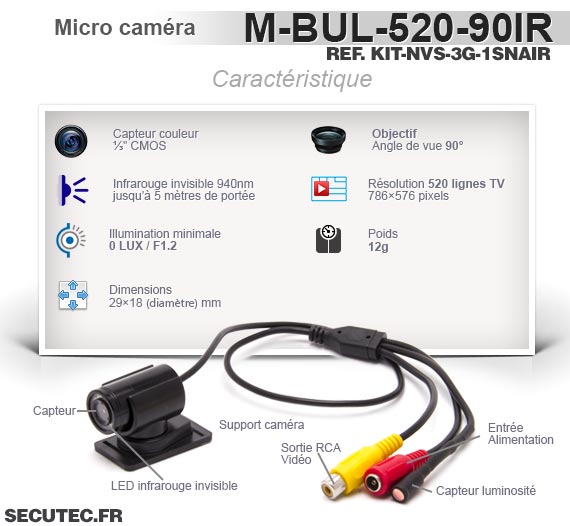 Conçue autour d'un capteur CMOS 1/3" 520 lignes TV avec un angle de vue de 90°, la micro caméra M-BUL-520-90IR vous permettra de filmer avec une résolution de 786×576 pixels.