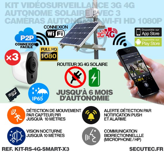 Kit videosurveillance 3G 4G autonome solaire avec 3 smart cameras Wi-Fi HD 1080P 64 Go