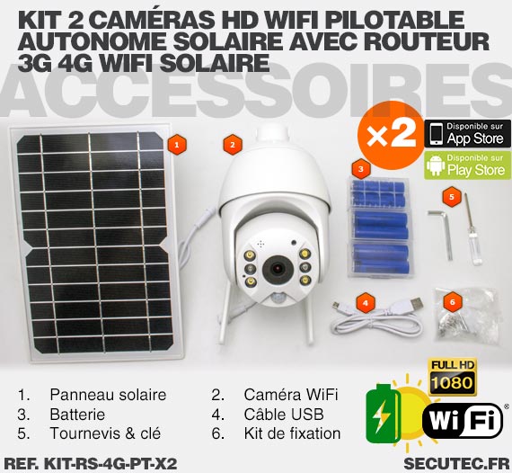 Kit videosurveillance 3G 4G autonome solaire avec 2 cameras pilotables solaires WiFi HD 1080P 64 Go