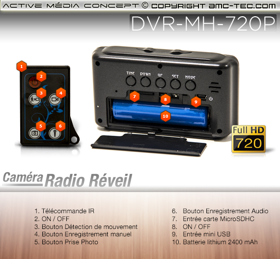 Cette micro horloge de bureau intègre dans son boîtier une caméra pinhole HD connectée à un enregistreur audio/vidéo numérique HD. L'horloge caméra enregistre des Vidéos HD, des photos ainsi que des enregistrements audio.