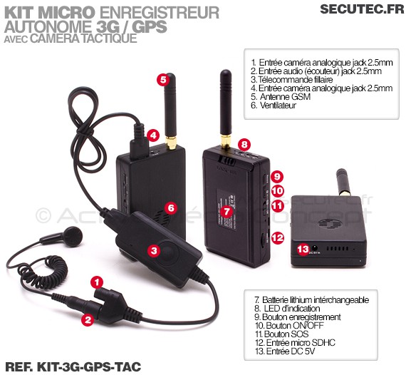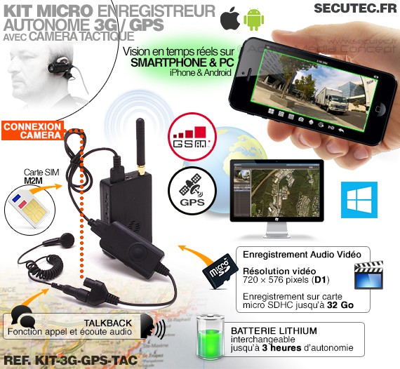 L'enregistreur portatif DVR-3G-GPS enregistre vidéo et audio (microphone intégré).