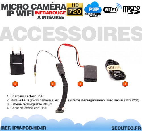 Embarquant un capteur CMOS 5 Mégapixels avec un angle de vue de 90°, le module enregistreur/micro caméra IPW-PCB-HD pourra enregistrer des vidéos avec une résolution maximale de 720P (1280×720 pixels) ou VGA (640×480 pixels).