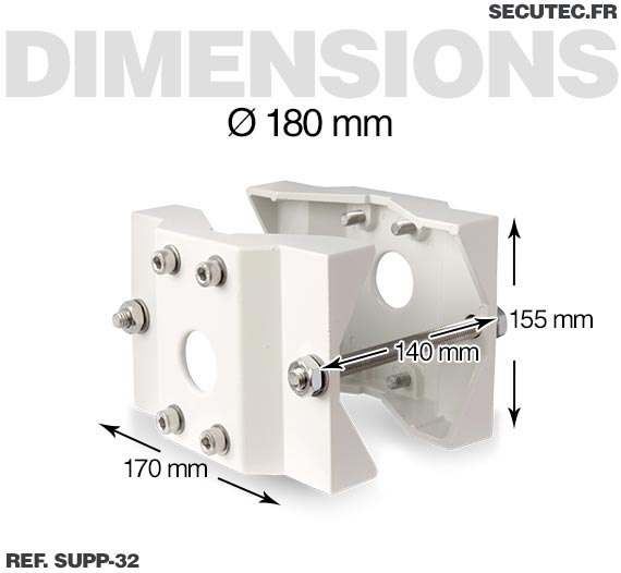 Support de fixation pour caméra de vidéosurveillance (180×145mm), fixation type étau, possibilité de montage sur un mat d'un diamètre maximum de 180mm.
