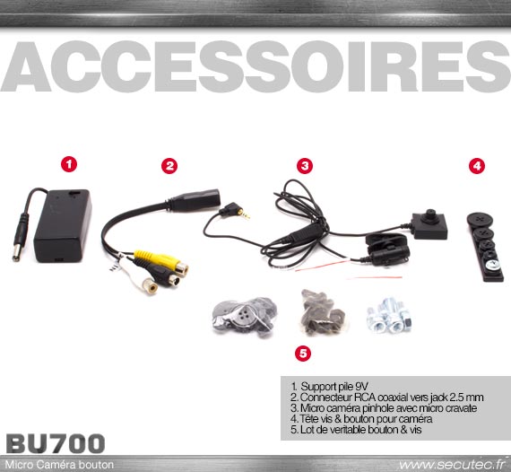 Elle est couplée à un micro-cravate sensible que vous pourrez fixer aisément grâce à son épinglette. Cette mini caméra est parfaite pour la dissimuler derrière une chemise en configuration "bouton" ou pour exemple, derrière une plainte, une planchette en bois , en configuration "vis".