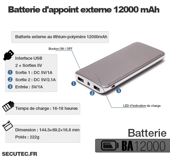 La batterie d'appoint externe de 12000 mAh vous permet de recharger vos appareils (DVR, micro enregistreur, iPhone, smartphone...) à tout moment lors de vos déplacements, et ce de manière autonome.