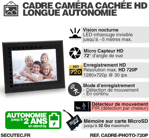 La caméra CADRE-PHOTO-720P, cachée dans un cadre photo pour photographie d'une taille classique de 13×18cm, vous permettra d'enregistrer audio et video, de jour comme de nuit.