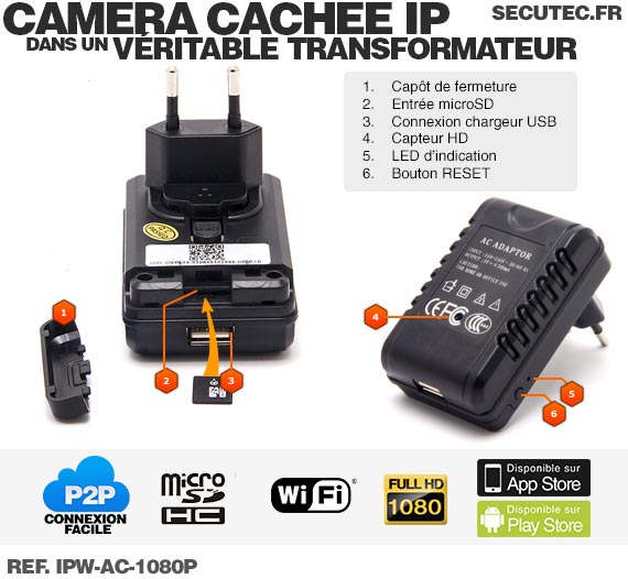 Le IPW-AC-1080P est un ensemble micro caméra IP HD WiFi avec un enregistreur, intégré dans un véritable transformateur. La caméra est conçue autour d'un capteur CMOS 5 mégapixel permettant de filmer avec une luminosité minimale de 1 LUX (F2.0), et un angle de vue de 90°.