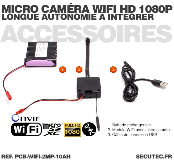 Embarquant un capteur CMOS 2 Mégapixels avec un angle de vue de 90°, la micro caméra IP WiFI à intégrer pourra enregistrer des vidéos avec une résolution maximale de 1080P (1920×1080 pixels).