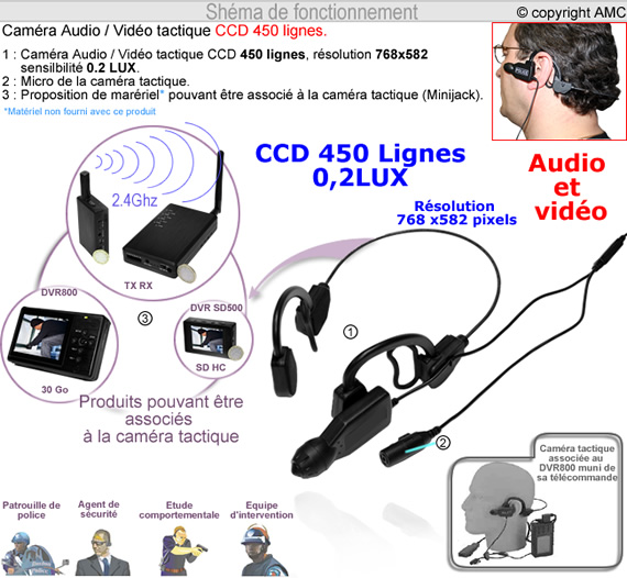 Exemple : l'utilisateur porte sur lui la caméra tactique alimentée par l'émetteur qui envoie le signal audiovisuel au récepteur. Ce dernier étant relié à une télévision pour un simple visionnage, ou à un enregistreur numérique pour un enregistrement des images et de l'audio.
