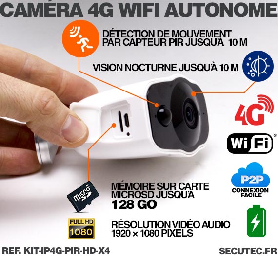 Notre kit de vidéosurveillance 4G est composé de 4 caméras sans-fil Wi-Fi autonome avec une résolution HD 1080P, la caméras sans-fil Wi-Fi se connecte à un mini routeur avec une clé 4G compatible tous opérateurs disposant de crédit internet (DATA).