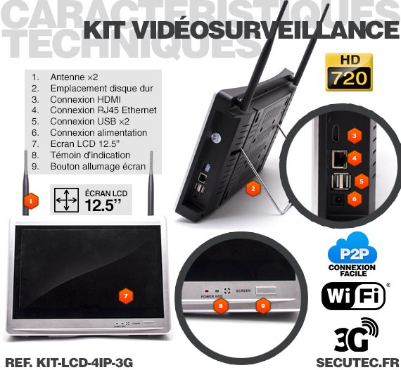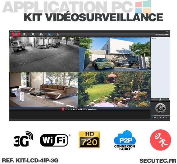 Kit composé d'un enregistreur de vidéosurveillance, d'une clé USB 3G et de quatre caméras IP WiFi HD 720P (1280×720 pixels), idéale pour surveiller une maison, un appartement ou bien encore une résidence secondaire pourvus de connexion internet WiFi (Box ADSL). Vous pourrez entre autres :