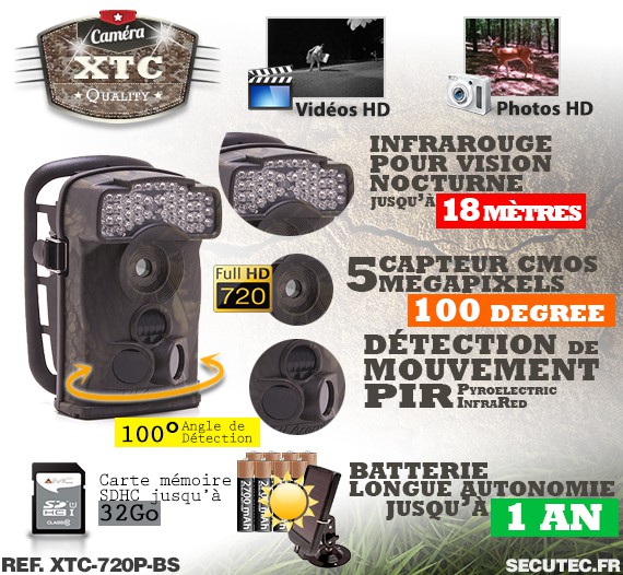 La caméra XTC-720P est une caméra de vidéo surveillance pour professionnels et particuliers. Elle intègre une caméra HD et un système d'enregistrement vidéo et photo sur carte SDHC.