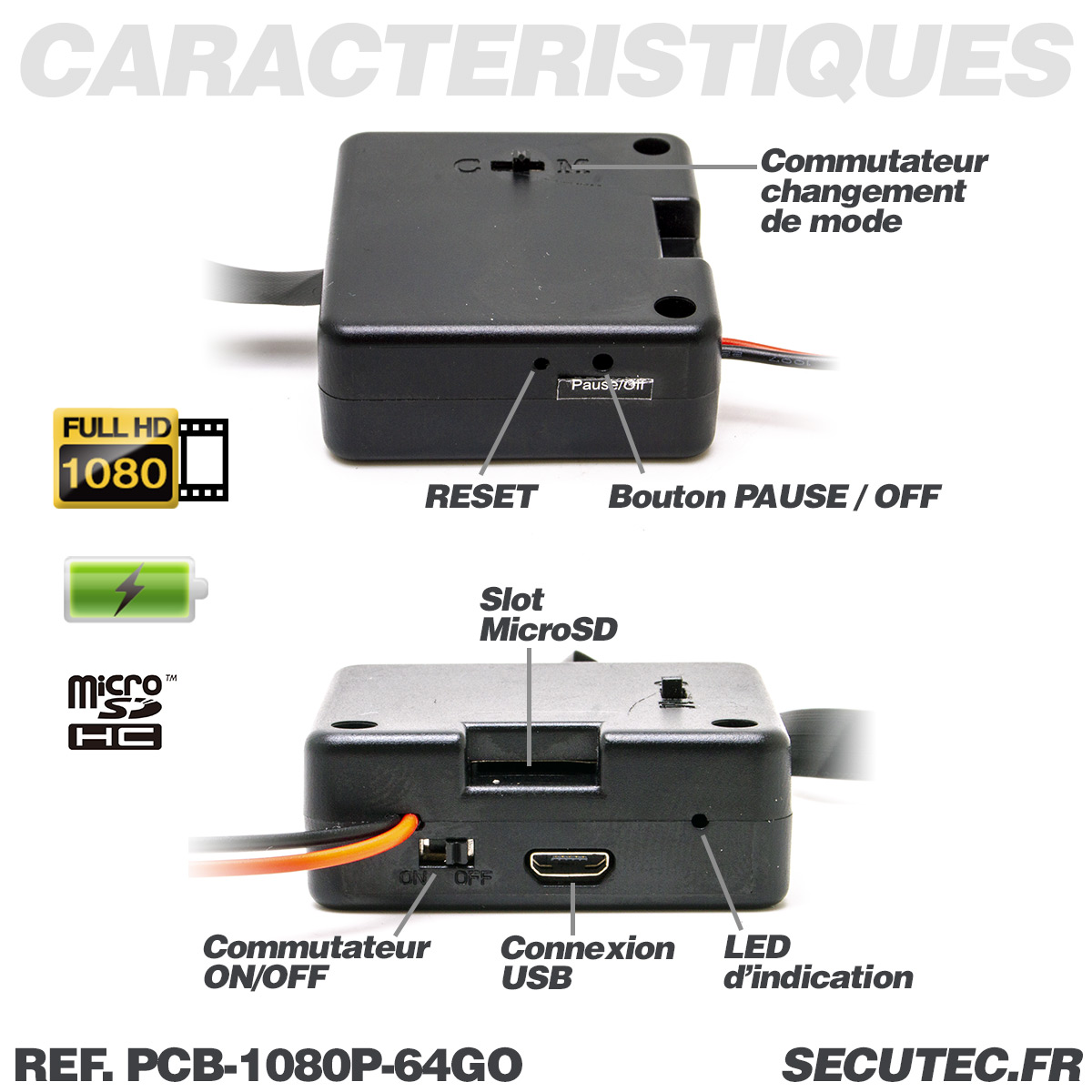 Embarquant un capteur CMOS 2 Mégapixels avec un angle de vue de 90°, le module enregistreur/micro caméra pourra enregistrer des vidéos avec une résolution maximale de 1080P (1920×1080 pixels) à 30 images par secondes.