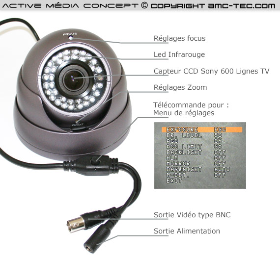 Our mini dome has a Sony CCD sensor 600 TV lines, the 36 LEDs lit giving it a range of up to 30 meters apart, for a minimum illumination of 0 lux.