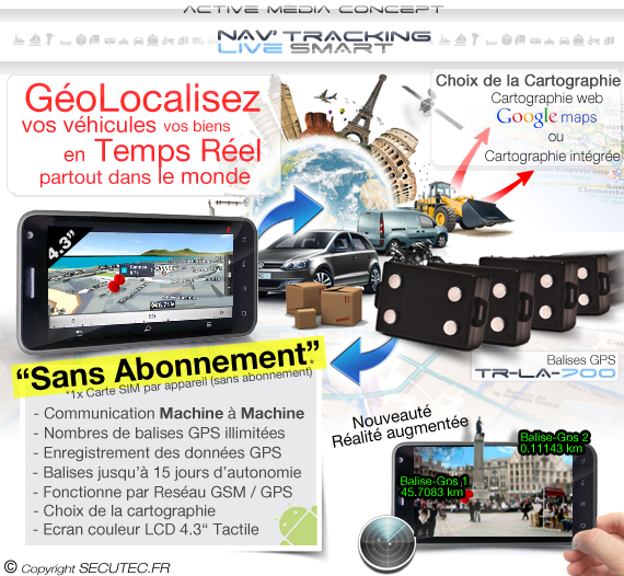 Insérez dans chacune d’entre elles une carte SIM ‘sans abonnement‘ et ‘tout opérateur téléphoniques compatibles‘ pour pouvoir communiquer avec le système de géolocalisation Nav Tracking Live.
