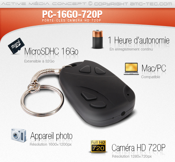 Installée à l'intérieur d'un boitier de télécommande, ce porteclé caméra enregistre des vidéos en haute définition720P avec une résolution de 1280×720 @ 30 ips et des photos d'une résolution de 1600 × 1200 px.