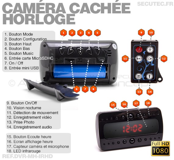 Cette micro horloge de bureau intègre dans son boîtier une caméra pinhole HD connectée à un enregistreur audio/vidéo numérique HD. L'horloge caméra enregistre des Vidéos HD, des photos ainsi que des enregistrements audio.